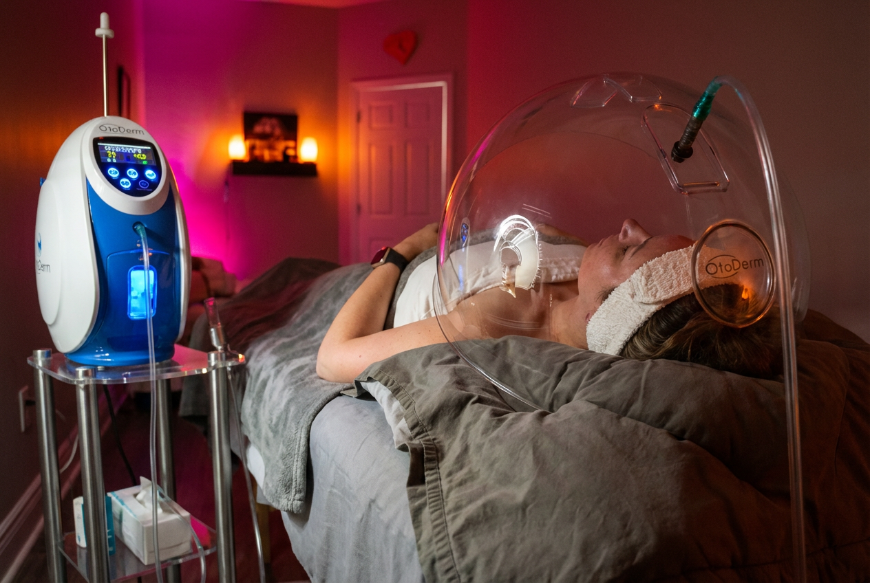 Our O2ToDerm Machine utilizes ANIONS – negative ions known to purify the air by removing airborne allergens, dust, bacteria, and viruses. This technology pulls air from the treatment room, separates out nitrogen, and releases a 90% oxygen stream. The oxygen is first pumped through an infusion gun, followed by a large dome that covers the skin, trapping in the beneficial anions. These anions promote skin health while having a positive impact on your mind, body, and soul.